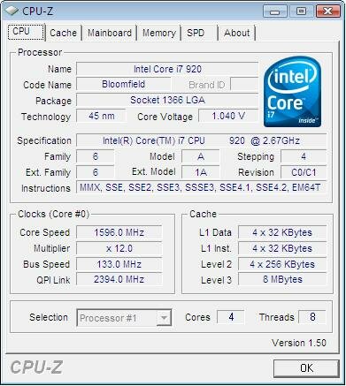 Не осталась в стороне и технология Turbo Boost. В нагрузке однопоточным приложением, частота процессора со стандартных 2.66GHz поднималась до 2.793 GHz – множитель автоматически увеличивался на 1. Аналогичная картина наблюдалась и в разгоне процессора.